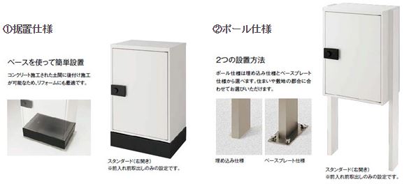 「宅配ボックスKT」は、様々な外観の住宅にも違和感なく調和するシンプルなデザインとベーシックな機能で、施工も簡単にできるのでリフォームにも最適です。玄関ポーチなど限られたスペースにもおすすめの「据置仕様」と、荷物を取り出しやすい高さで、住まいや敷地に合わせて配置できる「ポール仕様」の2つの仕様からお選びいただけます。